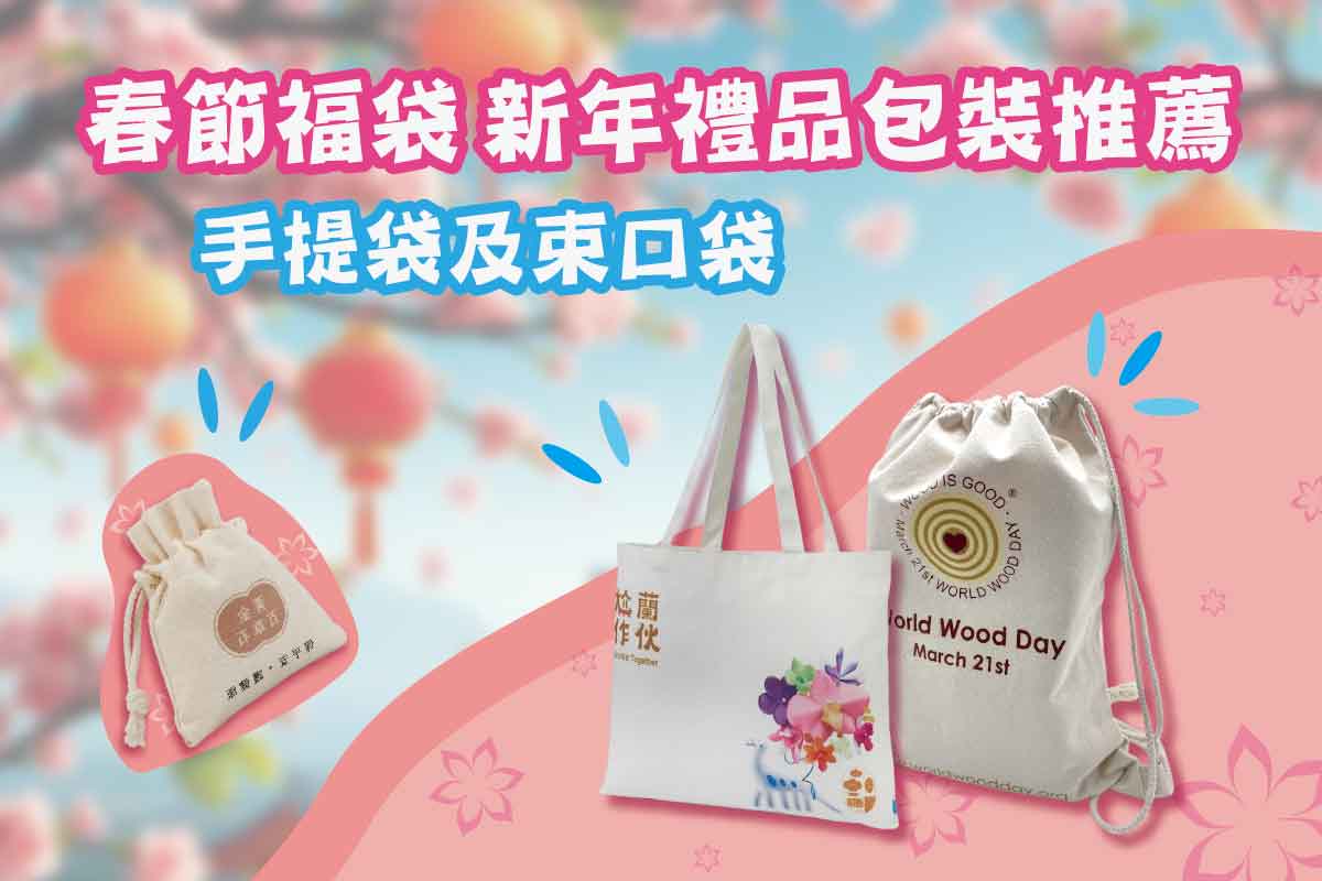 - 建議搭配緞帶或棉繩束口設計,並以節慶插畫或品牌吉祥物為主題。